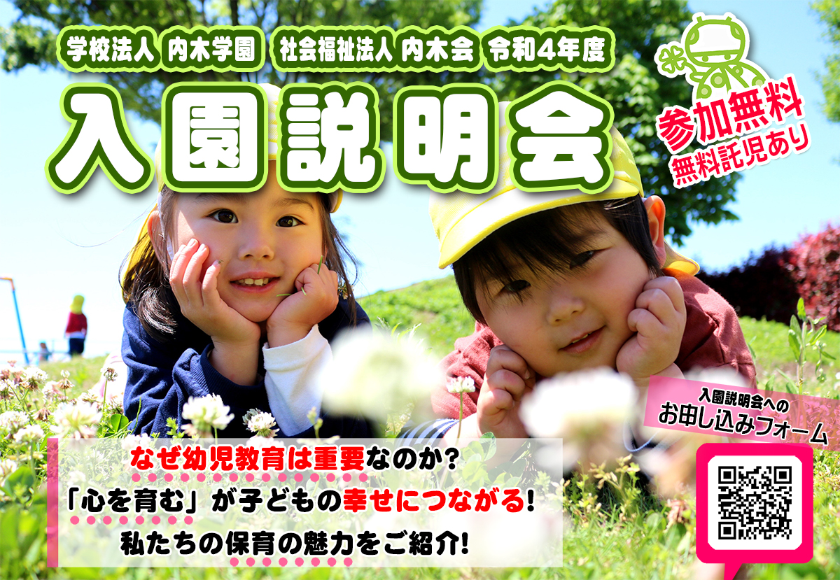 入園説明会では、①幼児教育の重要性のこと、②内木学園の特色ある教育のこと、③費用のこと、④設備・周辺環境のこと、⑤課外教室や学童保育、子育て支援のこと、などを中心にお話しいたします。 説明会後は園見学を行い、園内の施設や子どもたちの様子をご覧いただけます。また、その場の職員に質疑応答もできますので、ご不明な点はお気軽にご相談ください。 当日は無料の託児を行いますのでぜひご利用ください。 入園説明会のお申込みは、特設サイトの入力フォームよりお申し込みください。 |