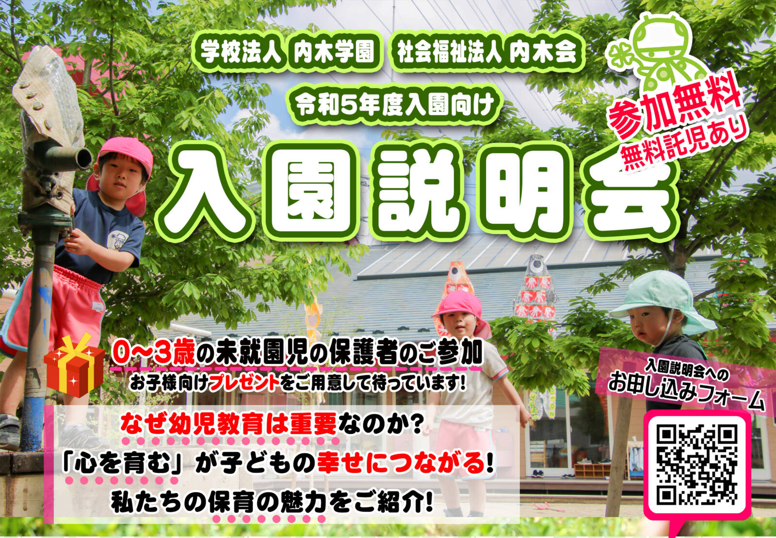 入園説明会では、①幼児教育の重要性のこと、②内木学園の特色ある教育のこと、③費用のこと、④設備・周辺環境のこと、⑤課外教室や学童保育、子育て支援のこと、などを中心にお話しいたします。 説明会後は園見学を行い、園内の施設や子どもたちの様子をご覧いただけます。また、その場の職員に質疑応答もできますので、ご不明な点はお気軽にご相談ください。 当日は無料の託児を行いますのでぜひご利用ください。 入園説明会のお申込みは、特設サイトの入力フォームよりお申し込みください。 |